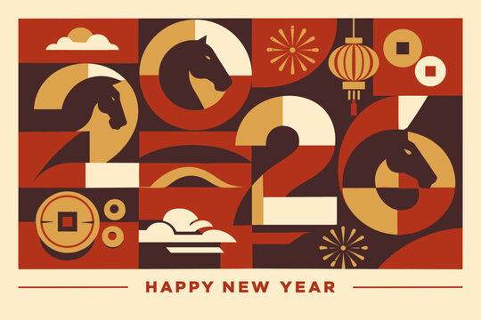 Happy new year 2026 poster with horse symbols and geometric festive shapes. Theme of celebration, zodiac style, and holiday mood