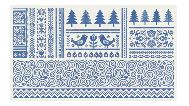 Charming folk art pattern with trees, birds, flowers and swirly vines for delightful holiday designs