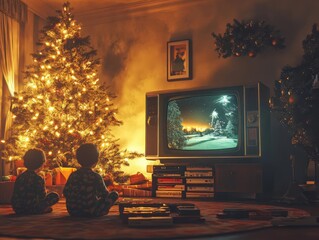Two kids sit on a rug watching a snowman-themed movie. The room is decorated for Christmas with twinkling lights and festive ornaments, evoking a holiday spirit.