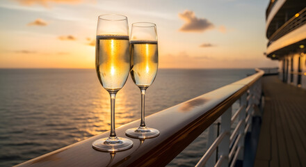 Golden hour toast: Champagne flutes at sunset on a cruise ship balcony offer a scene of serene luxury and opulent