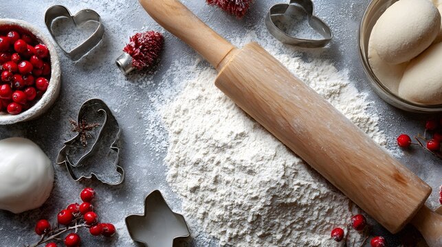 Flat lay of holiday baking ingredients flour rolling pin