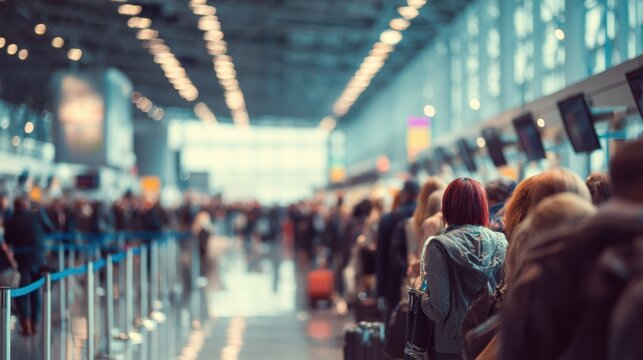 Busy airport scene depicting travelers in line, showcasing the hustle and bustle of air travel during peak hours.