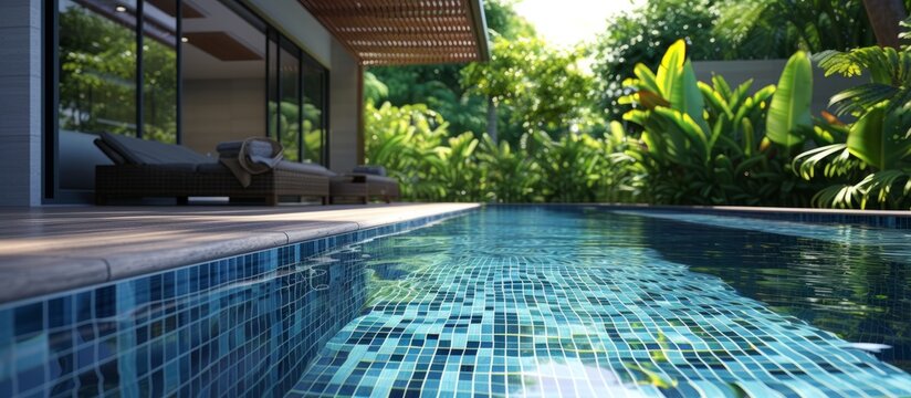 Asian woman relaxing poolside under summer sun