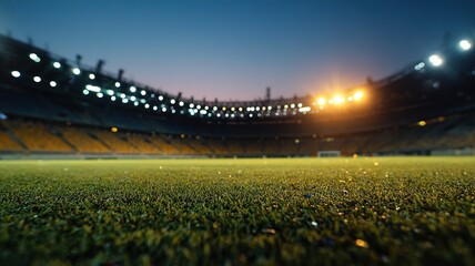 Wide view of empty soccer stadium at dusk with turf confetti, blurred stands and season finale vibe