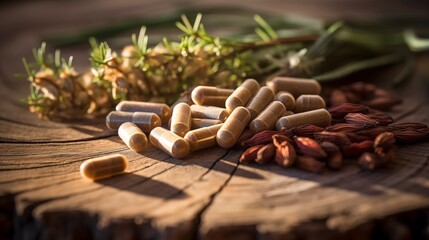 Herbal supplement capsules with fresh plants on wooden table representing natural medicine and organic healthcare concept.