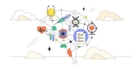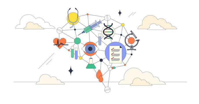 Systems thinking in healthcare visualized with interconnected icons like DNA, heart, and microscope, transparent background.