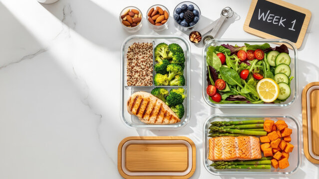 Healthy meal prep containers with grilled chicken salmon and vegetables