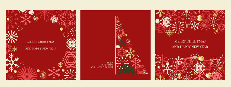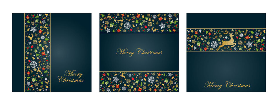 Pack of greeting cards with gold , red, green Christmas  deer, gifts, snowflakes, christmas tree on dark green background. Vector illustration. Gold holliday pattern