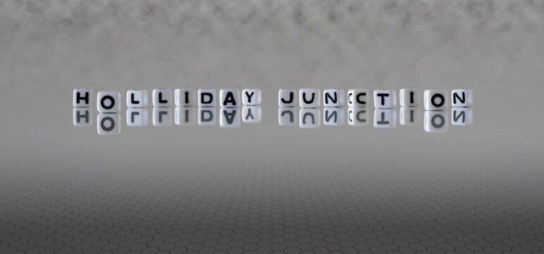 holliday junction word or concept represented by black and white letter cubes on a grey horizon background stretching to infinity