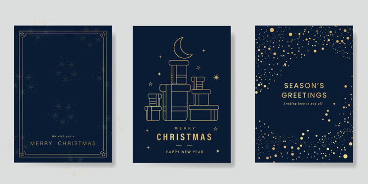 Luxury christmas and happy new year holiday cover template vector set. Gold twinkling star, gif, moon on navy blue background. Design for card, corporate, season's greeting, wallpaper, poster.