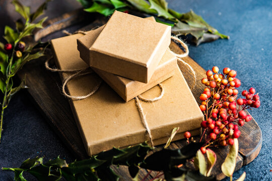 Hands wrapping gifts on rustic table with holiday decor