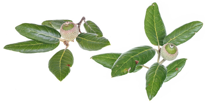 Holm oak branch with acorn (Quercus ilex), isolated on white background