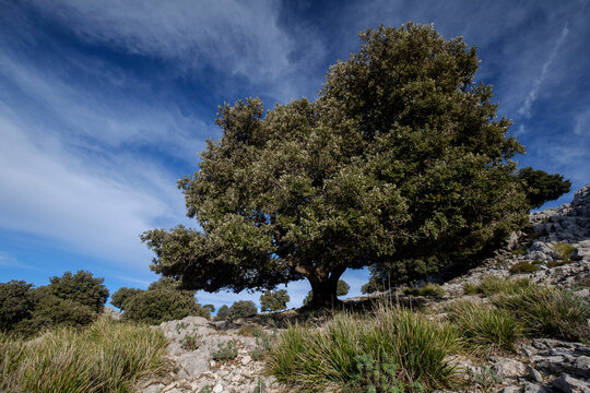 Holm oak, Quercus ilex, typical specimen, Son Nebot ridge, Escorca, Mallorca, Balearic Islands, Spain