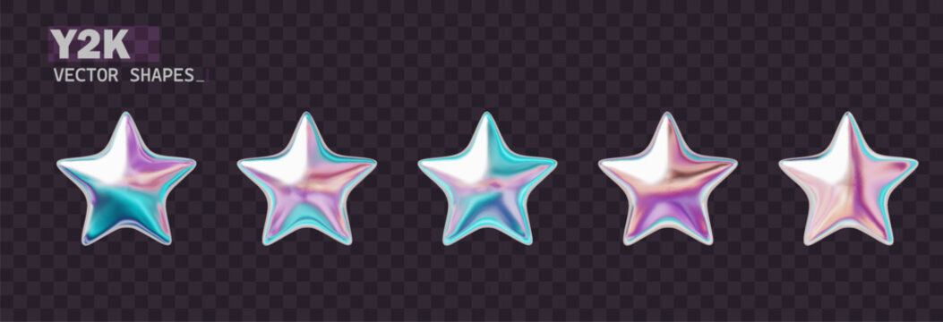 Chrome 3d star holographic collection on Y2K stile. isolated shiny chrome shapes 2000s and are perfect for futuristic designs.
