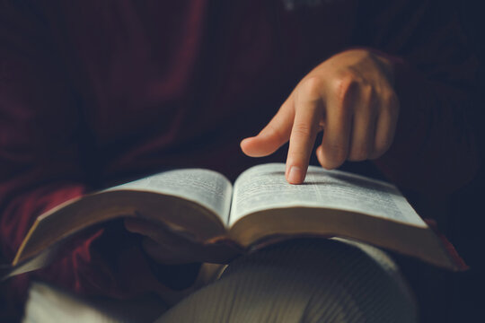 Christian man's hands while reading the Bible outside.Sunday readings, Bible education. spirituality and religion concept. Reading a book.education learning