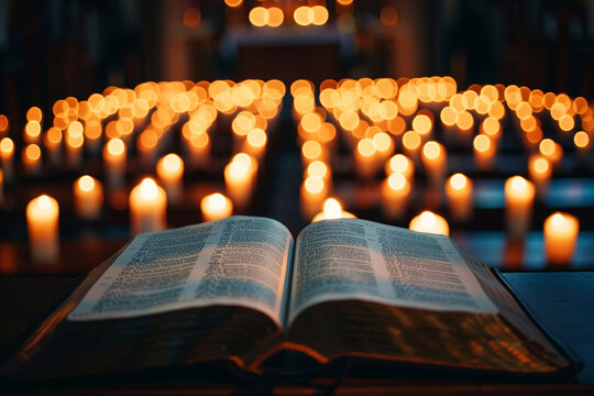 An open holy book sitting on top of a wooden table, ready for reading or study