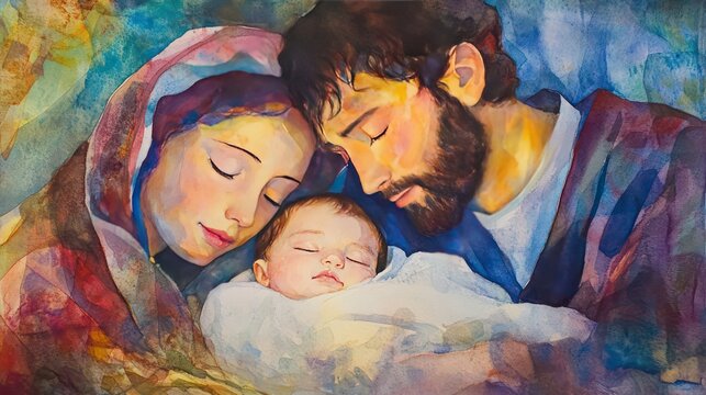 A watercolor painting depicting the Holy Family, Mary, Joseph, and baby Jesus, in a loving embrace.