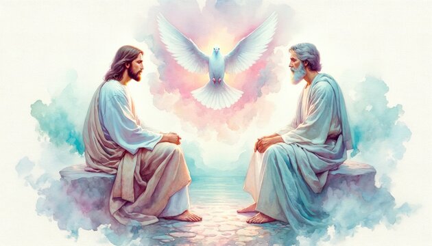 The Holy Trinity: the Father, the Son, and the Holy Spirit. Digital watercolor painting.