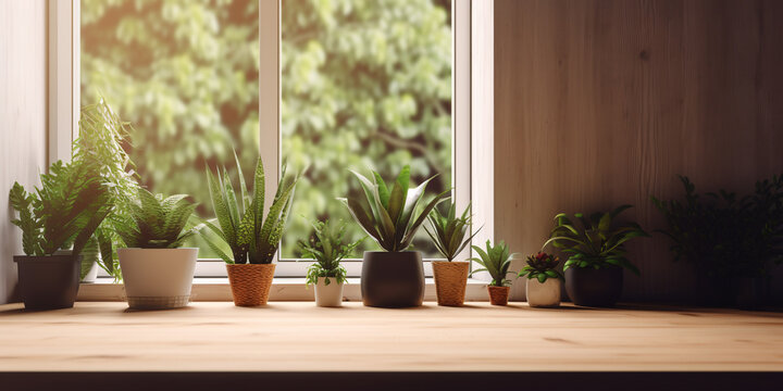 Generative AI, modern room with wooden table and home plants, top view, sunlight, window, background,  empty space for advertising goods, food, creativity, dining table, office, workplace, layout, eco