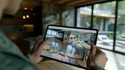 A person managing home energy through a smartphone app while enjoying a solar-powered house at dusk, surrounded by greenery and a swimming pool