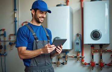 Smiling young man in uniform uses digital tablet. Inspects modern boiler heating system equipment, complex pipes. Pro tech service engineer checks smart heating installation. Plumber maintains
