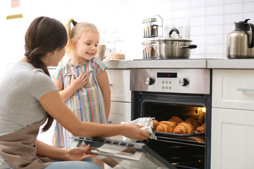 Close up bake view of excited little preschooler girl take muffins from oven cooking together with loving young mom, happy small daughter make prepare sweet pastries with caring mom on weekend at home