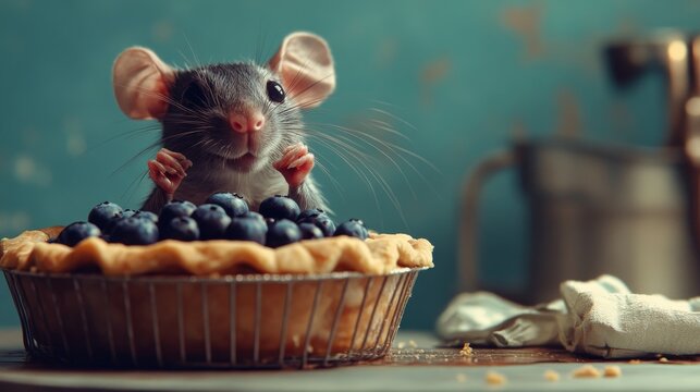 A Curious Mouse Posing in a Blueberry Pie, Close-up, Food Photography, Animal Portrait, Mouse, Blueberry Pie, Food Photography