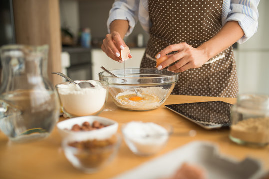 culinary, bake and people concept - happy smiling young woman cooking food on kitchen at home putting batter in baking dish for cupcakes