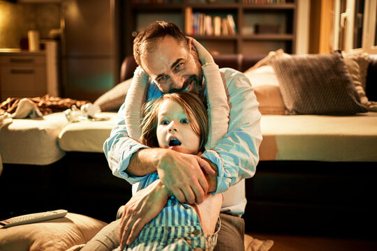 Father and daughter watching tv in the living room at home and eating popcorn