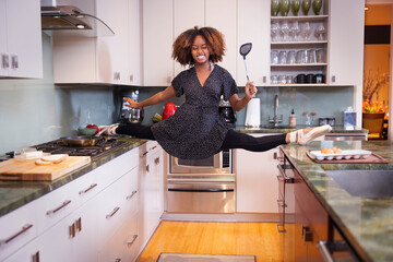 Young Afican American woman learning online  cooking class via tablet computer in kitchen at home