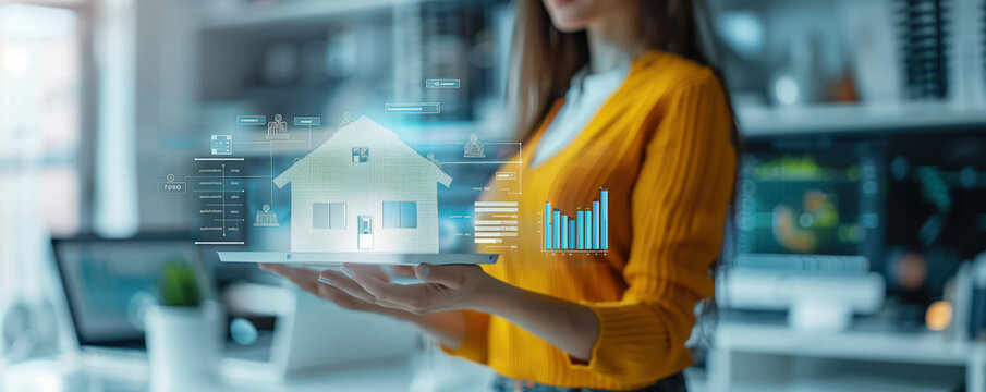 Businessman interacting with smart home system interface, managing property technology and digital real estate