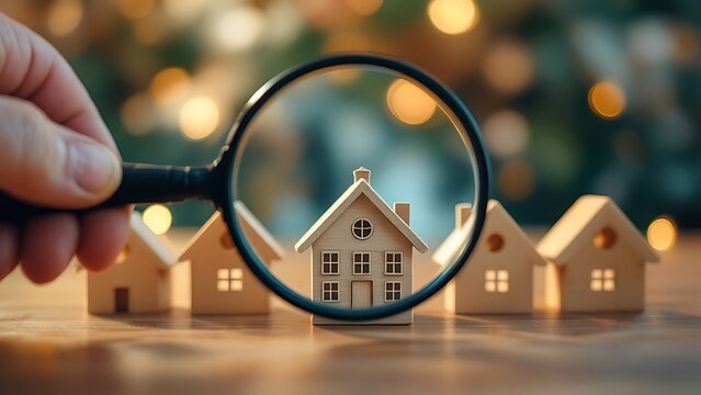 Hand holding magnifying glass and looking at house model, house selection, real estate concept.