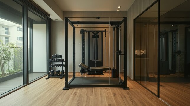 A sleek, modern home gym with state-of-the-art machines and free weights, offering a cutting-edge space for fitness enthusiasts.