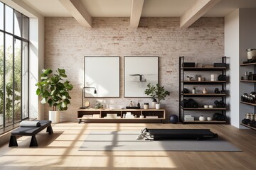 Modern home gym setup with sleek equipment with natural light through large window