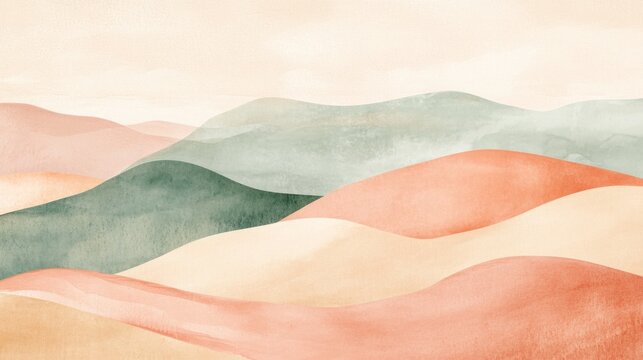 This artwork showcases an abstract landscape that blends neutral earth tones with soft greens. The flowing shapes create a calming and harmonious visual experience