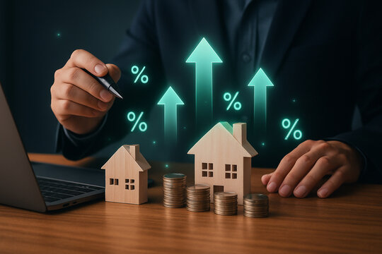 Real estate investment concept. Man touch virtual house icon for analyzing mortgage loan home and insurance real property mortgage. interest rate, Investment planning, business real estate.