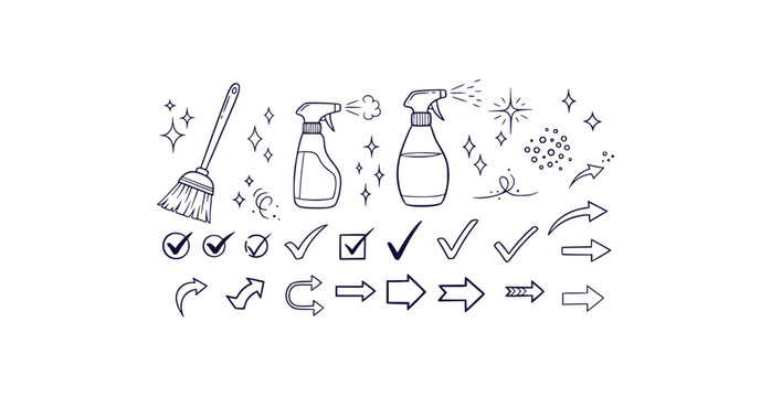Hand drawn doodle icons for home organization cleaning and task completion with checkmarks and arrows