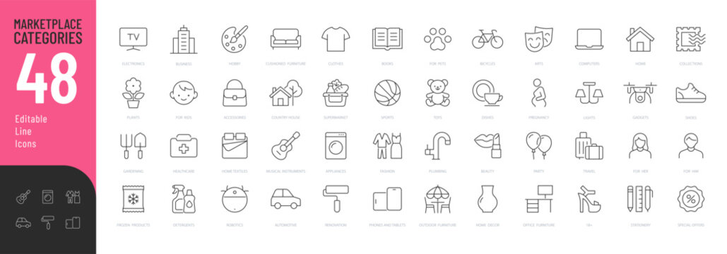 Marketplace Categories solid icons collection. Vector illustration in modern thin line style of e-commerce related icons: household goods, electronics and household appliances, clothing, and more.