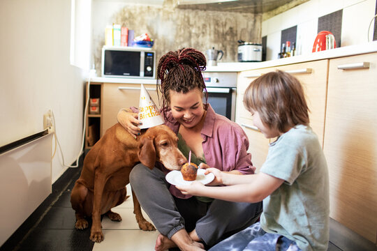 Family celebrating dog's birthday with cupcake and party hat in the kitchen