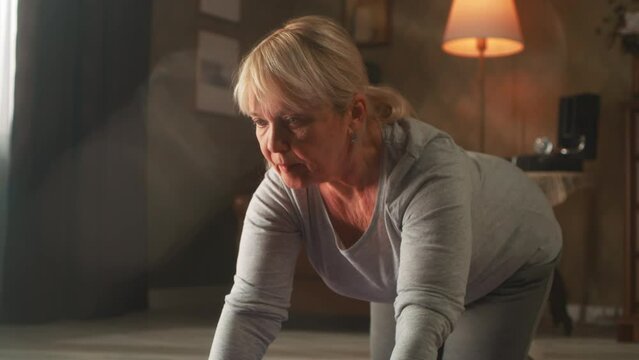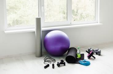 Woman exercising at home in the living room on yoga mat. House fitness workout, sport training concept. Focus on gym exercise equipment, kettlebell, dumbbell barbell. Female doing pilates, stretching.
