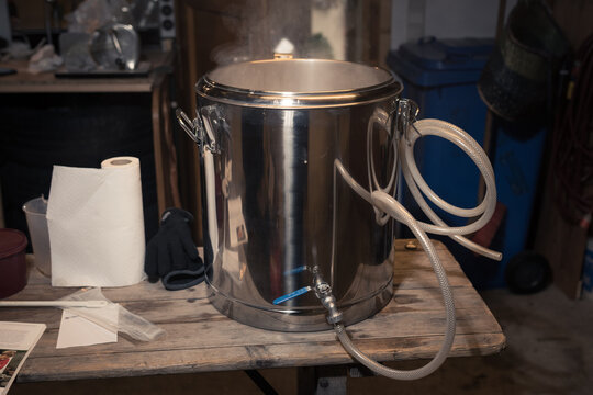 Stainless steel brewing keg and other micro brewery equipment on wooden table in garage