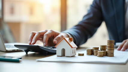 Reverse mortgage, mortgage loan for homebuyers, financial concept : One-story model house on a calculator with green bokeh background, depicting a calculation for a money borrower to buy or own a home