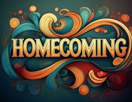Word ‘Homecoming’ written in stylized retro bubble script lettering