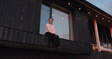 Young Woman Relaxes by Black Wooden Cabin, Embracing Rustic Log Mountain Architecture from a Low Angle View