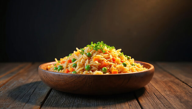 A wooden bowl of tasty fried rice with peas and carrots sits on a rustic table. This classic Asian dish is garnished with fresh green herbs for added appeal and freshness.