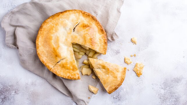 Freshly baked apple pie with a golden crust, partially sliced, revealing tender apple filling, placed on a light fabric background, showcasing delicious homemade dessert appeal