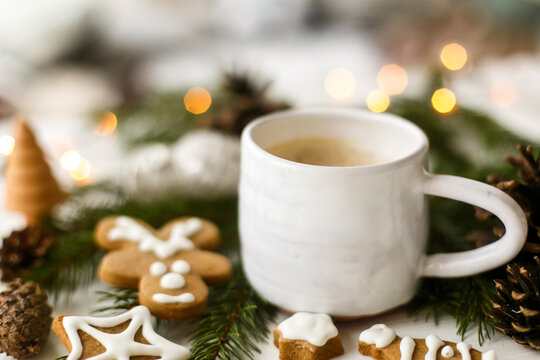 Coffee, homemade gingerbread cookies, pine cones decorations and warm lights on white  table