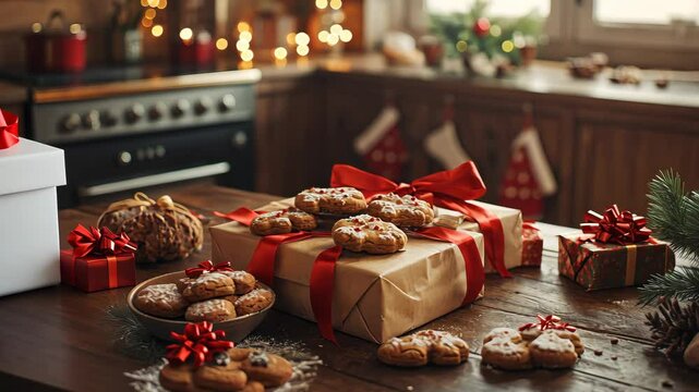 Wrapping homemade Christmas cookies in festive packaging with ribbons, tags, and bows, on a rustic kitchen counter. . Video