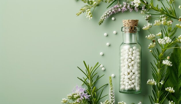 banner showing homeopathic beads in a glass bottle on a light green background, copy space, background, herb, flower