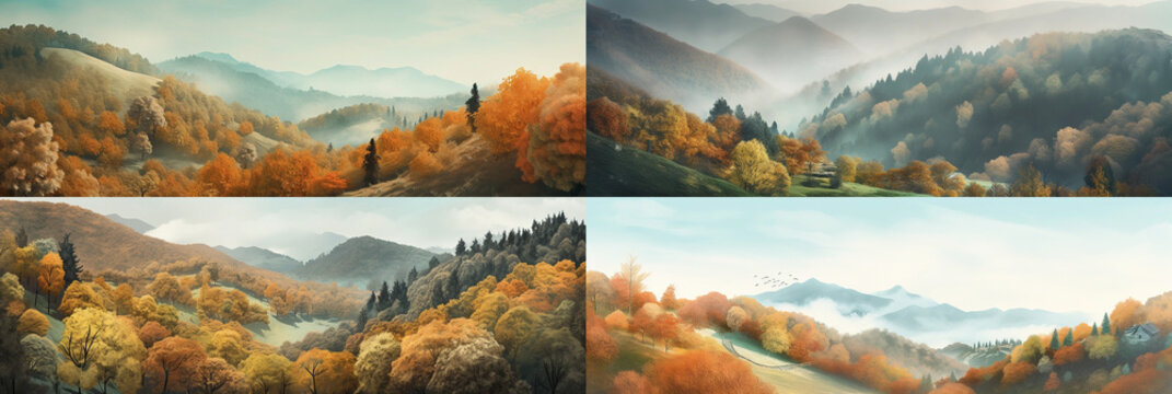 With a 10:3 aspect ratio, these four frames of optimized homepage banner background images feature ultra-realistic illustrations, textures, and scenes of autumn, hills, and forests.  Generative AI